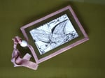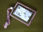 Illustration på begge side af glasramme. Ophængning af plantefarvet tekstil og keramikperle.